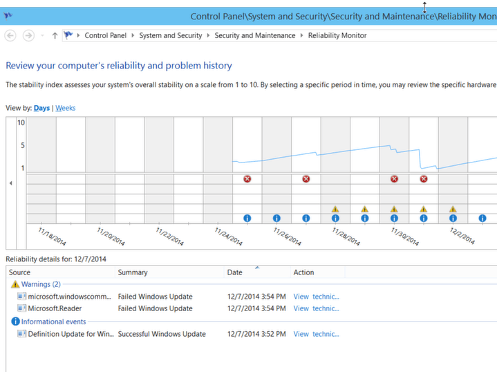 The Windows Reliability Monitor is included in Windows 2008 and later versions of Windows. The red Xs in the screen show below show critical operating system events. You can click on the X to get detailed information drawn from the Windows event log. To run it type ‘reliability’ in the Start menu.