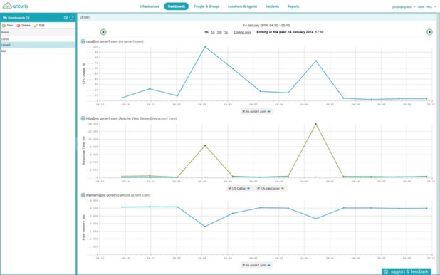 One product that does both component and end-to-end monitoring is Anturis. The product works for in-house data centers or those operating in the cloud. It works by pinging the web server for response time and mimicking a user by entering transactions to test the latency of the components that make up the application. For each server, it measures disk I/O, CPU utilization, processes and threads, memory utilization, caching, swap space, response time, and more.