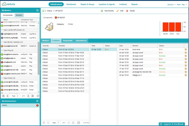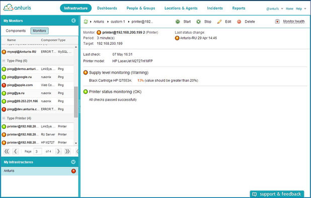 With Anturis 1.5, you can monitor every element of your IT infrastructure – servers, applications and now printers. Your printer may not be working properly for a number of reasons, including paper jams, an empty cartridge or technical problems. The Anturis printer monitor shows if your printer works properly and if there is enough ink in the cartridge.