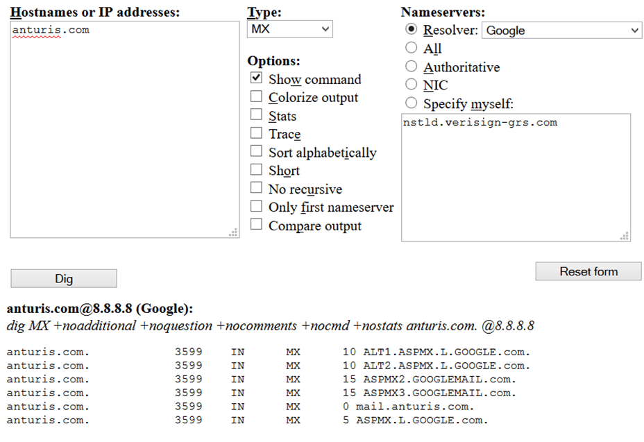 In the screen below, I selected the DNS servers at Google. The website shows me that the IP address for Anturis is 67.225.148.163. This means that I could enter https://67.225.148.163 to open the Anturis website instead of the domain https://anturis.com (Anturis forwards all their http traffic to https, so if you enter http:://67.224.148.163 nothing will answer) in order to skip the DNS lookup.
