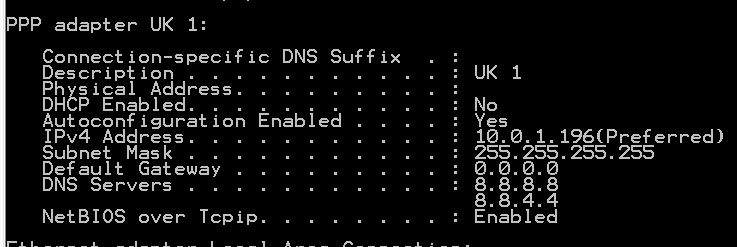 Here is how to illustrate that. I have connected to a VPN, so my traffic is going out over IP address 10.0.1.196 per the routing table. As you can see the VPN company I have connected to has set my DNS IP address to use Google for DNS lookups (8.8.8.8 and 8.8.4.4).