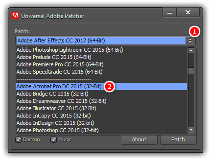 19. Click the pull-down button (1), scroll down until you find Adobe Acrobat Pro DC 2015 (32-Bit), then click on it (2).