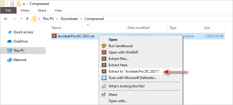 5. Right-click on Adobe.Acrobat.Pro.DC.2021.rar and select Extract to. If you’re asked for a password, type 123.