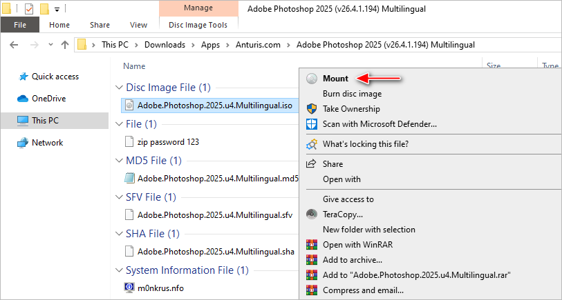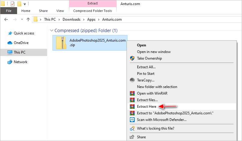 5. Right-click on the ZIP archive file that you’ve just downloaded, then select Extract Here. If you’re asked for a password, enter 123 into the text field and then click OK.