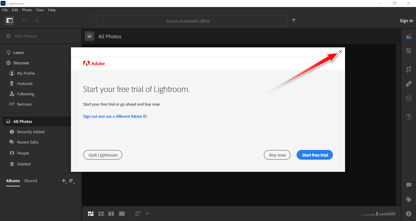 11. If it asks you to start a free trial, ignore it by clicking the close button. The main window will also close automatically as soon as you click that button.