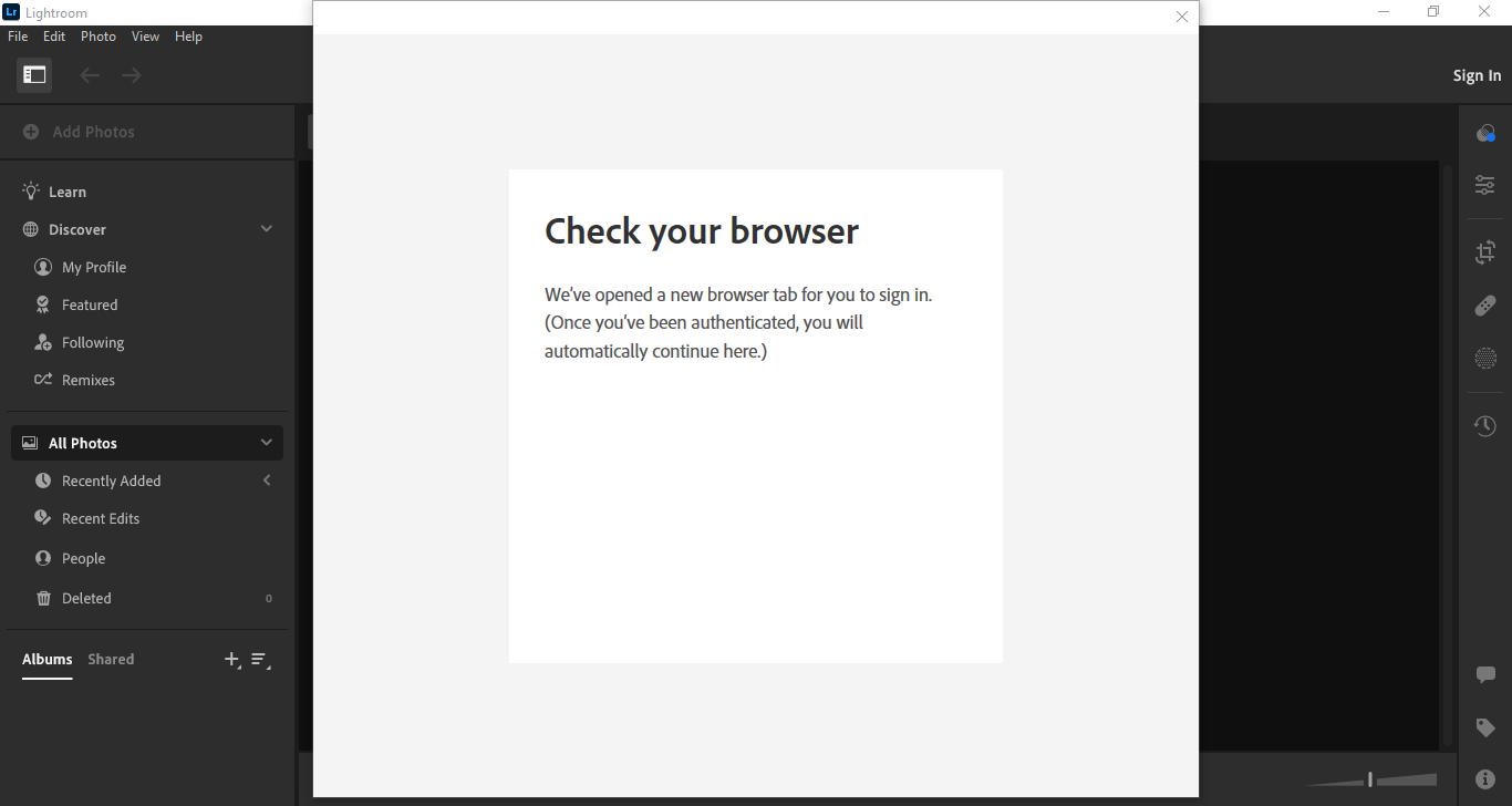 9. Once the main window opens, Lightroom will open a web page in your default browser where you are required to log in to your account, but we strongly suggest that you should create a new account instead of using your existing account.