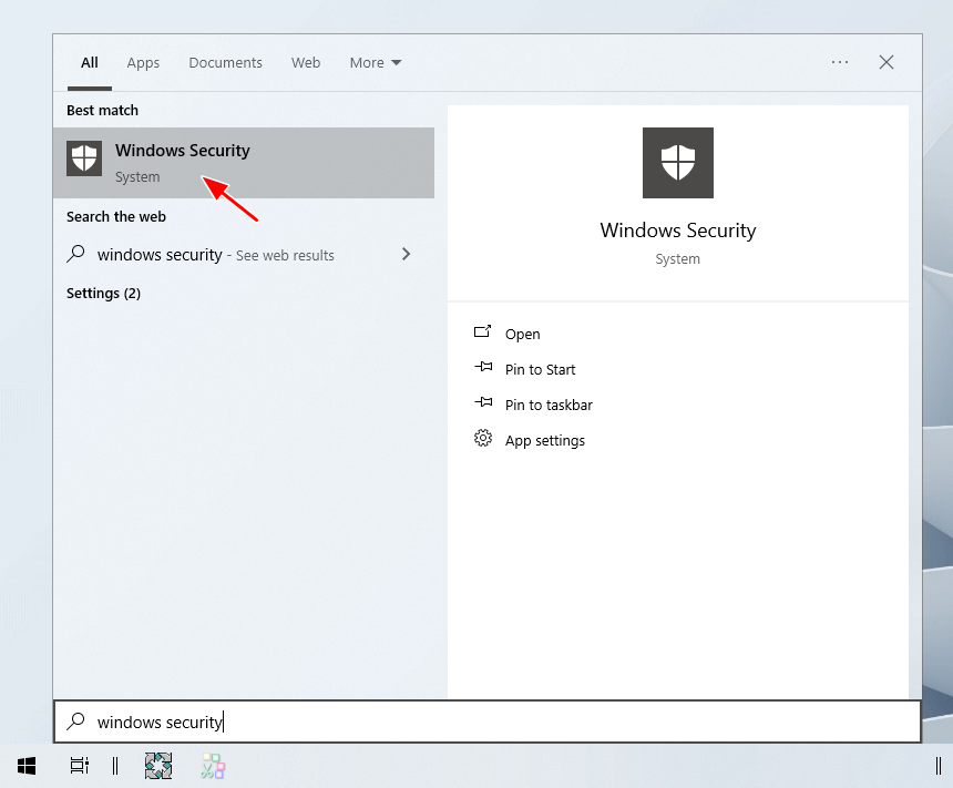 1. Disable your antivirus to make sure that it won’t interfere with the installation process. You can turn it back on after the installation is completed. Click the Start Menu, type Windows Security, and then click on it.