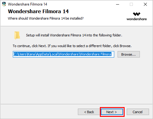 10. You can specify where you want to install Wondershare Filmora 14, or you can just click Next to proceed with the installation.