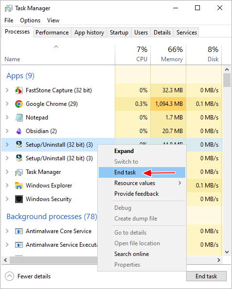 14. Right-click on Setup/Uninstall (32 bit), then click End Task to close the Wondershare Filmora 14 installation window.