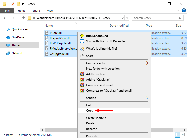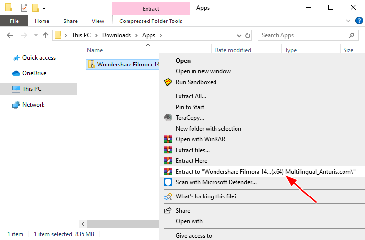 5. Extract the Wondershare Filmora 14 installer from the archive. Right-click on it, then select Extract to.