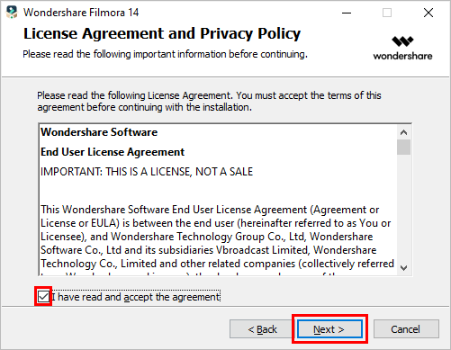9. Tick the small box next to “I have read and accept the agreement,” then click Next.