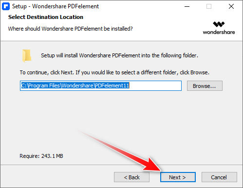 10. Click Next to install Wondershare to the default location.