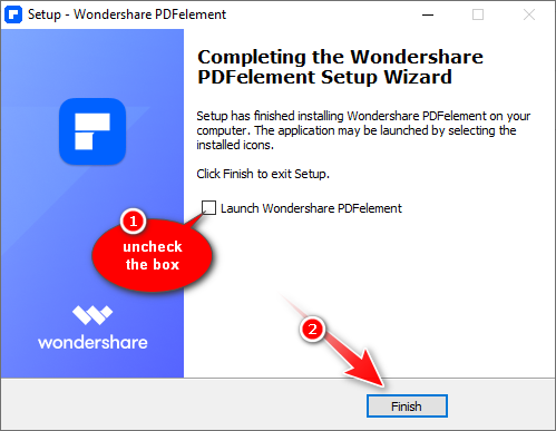 12. Uncheck ‘Launch Wondershare PDFelement‘ and then hit the Finish button.