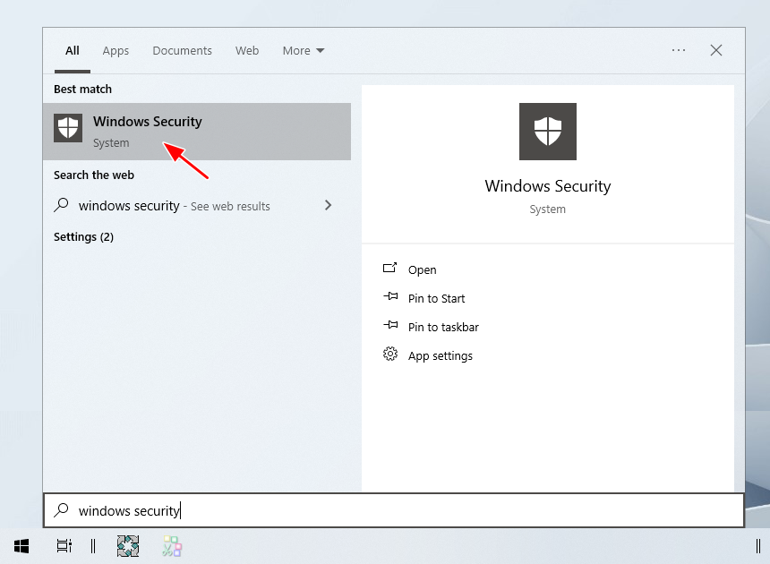 1. Before installing Wondershare UniConverter, you need to disable your antivirus. Click the Start menu, and then open Windows Security.
