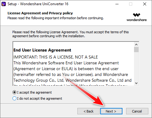 9. Make sure that the ‘I accept the agreement‘ box is checked before clicking the Next button.