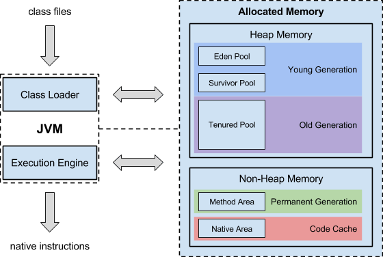 - Method Area. This area was previously known as the permanent generation where loaded classes were stored. It has recently been removed from the JVM, and classes are now loaded as metadata to native memory of the underlying OS.