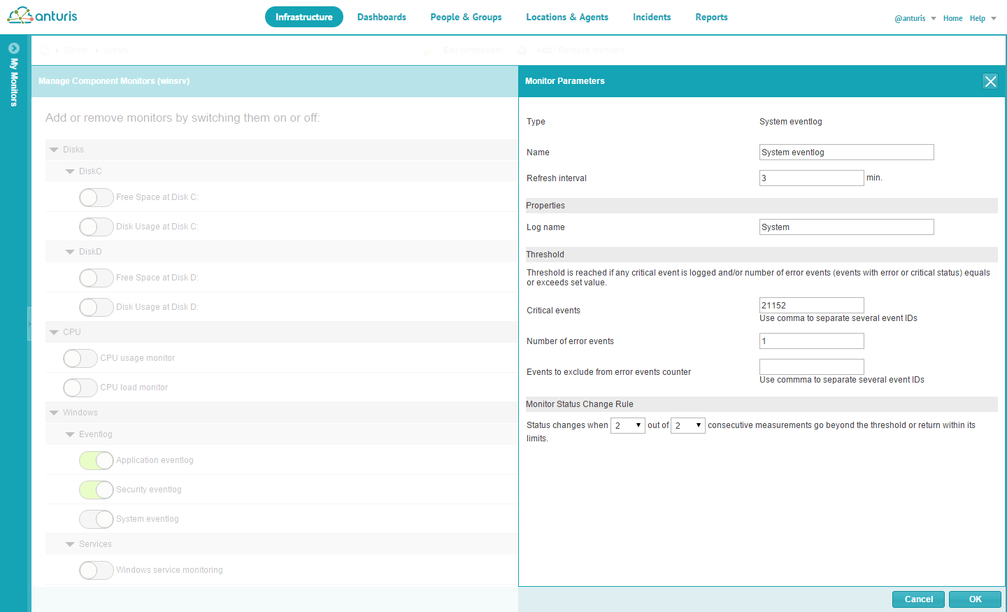 Then choose which Event Log categories you want to monitor and configure monitoring parameters in a component management window.